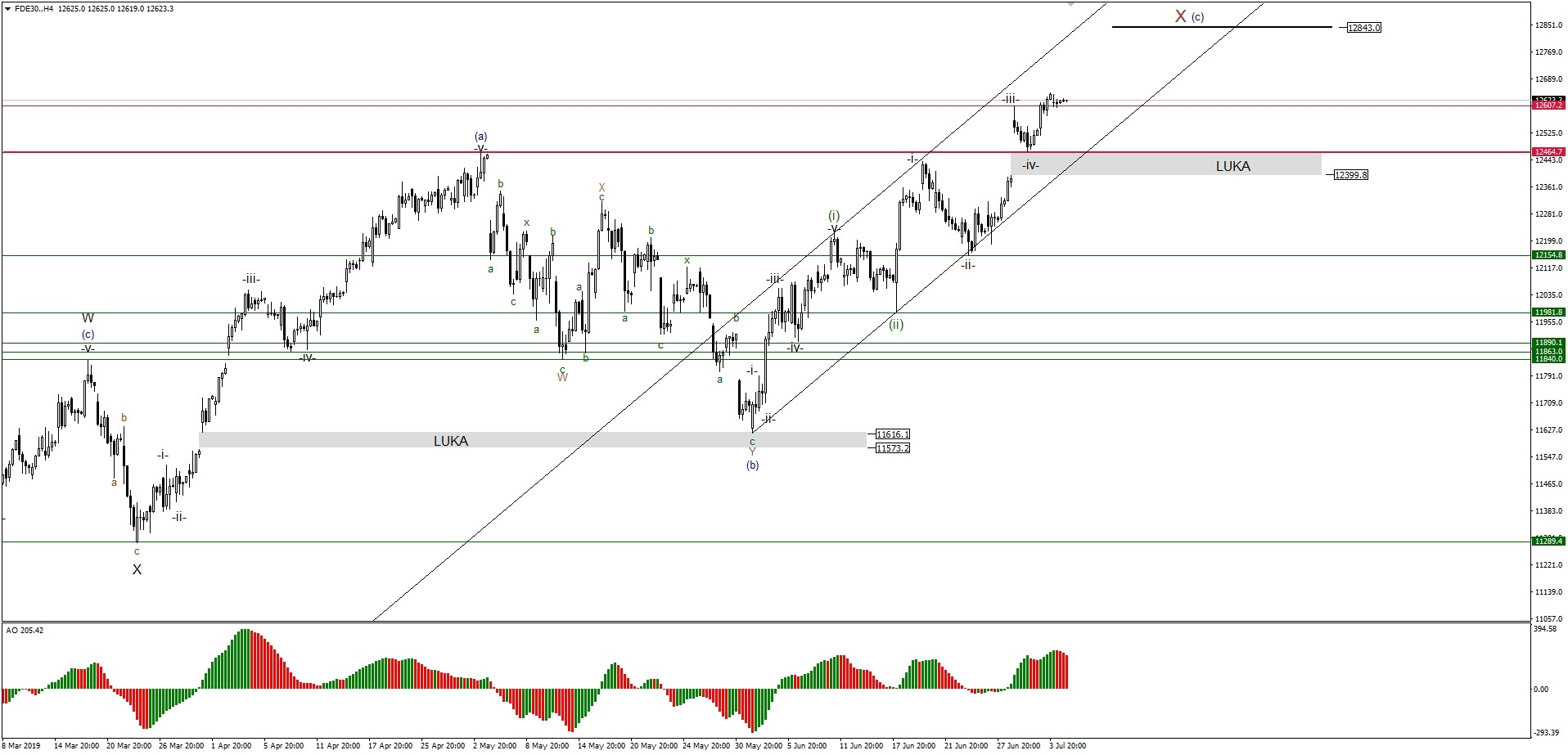 Niemiecki indeks szerokiego rynku DAX wybił poziom oporu technicznego, a z punktu widzenia teorii fal Elliotta, poziom szczytu fali trzeciej niższego rzędu. Ten poziom był zlokalizowany na 12 607 punktach i teraz będzie służył jako wsparcie techniczne dla ceny. Warto zauważyć, że utworzona została również fala czwarta niższego rzędu, z dołkiem na poziomie 12 464 punktach, tak więc obecnie rozwijana jest fala piąta impulsu wzrostowego. Jak wynika z projekcji geometrycznej Fibonacciego, minimalny poziom docelowy dla tej fali wzrostowej to 12 852 punkty, więc jest o co walczyć, tym bardziej że ten poziom może być zakończeniem fali (iii) wyższego rzędu i nadal do wykonania pozostanie fala (iv) i fala (v) wyższego rzędu. Z drugiej strony, poniżej poziomu wsparcia na 12 469 mamy lukę wzrostową, która ma swoje dolne ograniczenia na 12 399 punktach. Jak wiemy rynki, a szczególnie indeksy giełdowe mają tendencję do zamykania luki, wiec warto obserwować również ten poziom cenowy.