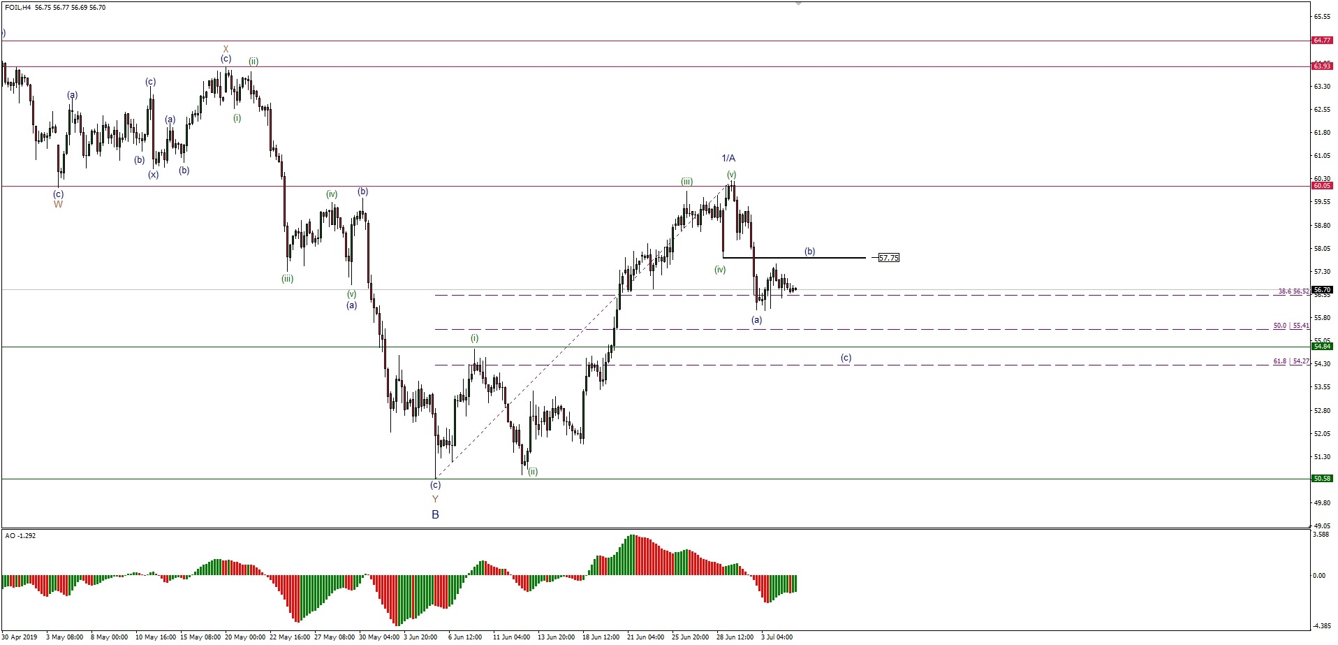 Sytuacja na rynku Ropy WTI rozwija się zgodnie z wcześniejszym scenariuszem falowym, w którym fala (a) niższego rzędu została zakończona na poziomie 56.02 (poziom ten był dwukrotnie przetestowany), a następnie rynek zaczął rozwijać falę (b) lokalnej korekty wzrostowej i prawie przetestował poziom dołka fali (iv) niższego rzędu na poziomie 57.75. Fala (b) nie może jeszcze definitywnie zostać uznana za zakończoną, więc należy zwrócić uwagę na możliwość dalszego jej rozwinięcia w kierunku nieco bardziej złożonej czasowo i cenowo korekty. Sytuacja taka utrzyma się tak długo, jak poziom lokalnego wsparcia i jednocześnie dołek fali (a) nie zostanie impulsywnie wybity dołem, co jednocześnie będzie oznaczać, że rynek wyrysowuje kolejną falę spadkową, czyli falę (c) wyższego rzędu. Poziom docelowy dla fali (c) jest obecnie usytuowany w strefie pomiędzy wsparciem technicznym na 54.84 a poziomem 61% zniesienia Fibonacciego na 54.27. Dopiero po zakończeniu fali (c) możliwe jest ponowienie cyklu wzrostowego wyższego rzędu.