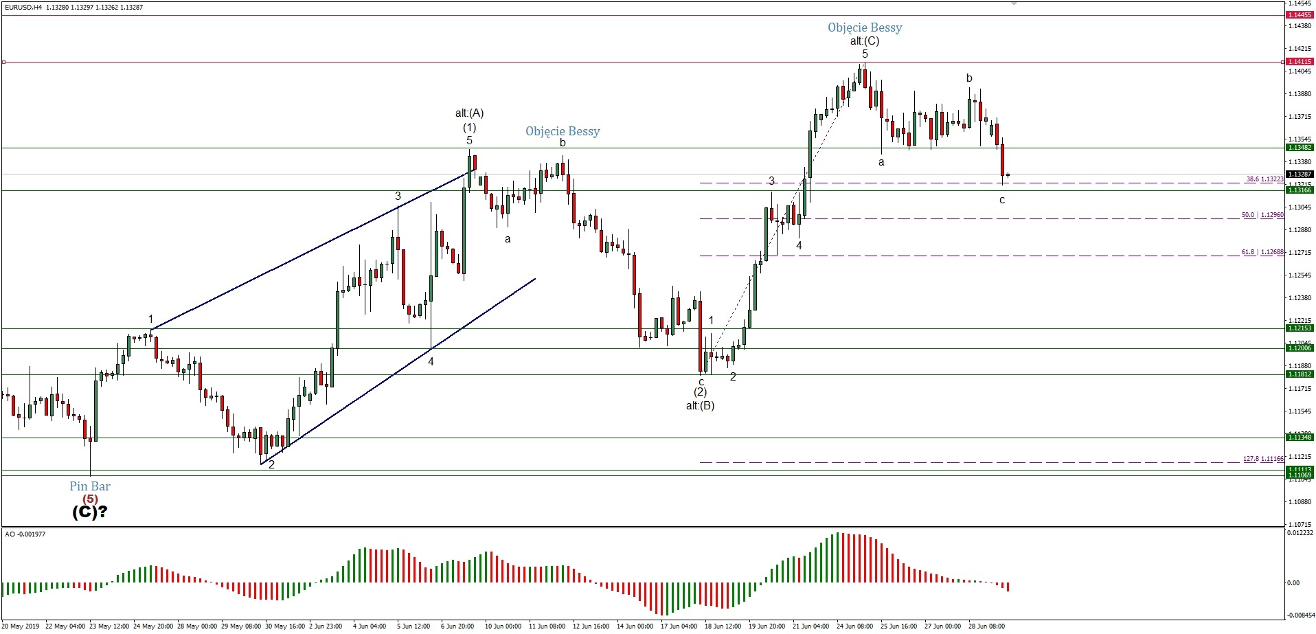 Korekta spadkowa na najpopularniejszej parze walutowej świata, czyli EURUSD mogła już zostać zakończona, czego potwierdzeniem jest trójfalowy ruch spadkowy w kierunku poziomu 38% zniesienia Fibonacciego na 1.1322. Aby potwierdzić zakończenie korekty spadkowej, byki muszą dynamicznie wybić poziom lokalnego oporu technicznego zlokalizowanego na 1.1348 i podążać w górę, w kierunku poprzedniego szczytu fali b oraz szczytu fali 5 na 1.1411. W przeciwnym bowiem razie prosta korekta ABC może zacząć ewoluować w kierunku bardziej złożonej czasowo formacji a ponadto dodatkowo zaliczyć jeszcze położone niżej poziomy zniesienia Fibonacciego czyli poziom 50% na 1.1296 oraz poziom 61% na 1.1268. Im głębiej będzie sięgać korekta spadkowa i im dłużej będzie ona trwała, tym mniejsze są szanse na powrót wzrostów i kontynuację wybicia z Klina Kończącego, który jest widoczny na wyższych interwałach czasowych. Najważniejszym poziomem dla strony popytowej pozostaje poziom 1.1181, gdyż jego naruszenie spowoduje unieważnienie scenariusza wybicia górą z Klina Kończącego i powrót ceny z powrotem do poziomów położonych poniżej 1.1200.