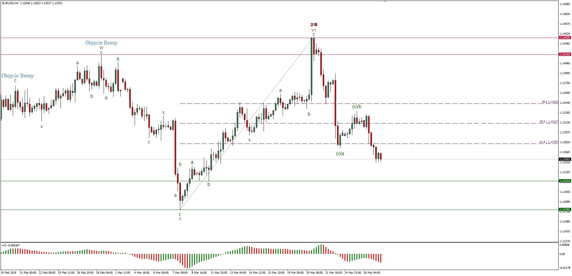 Na koniec jeszcze szybki rzut oka na rozwój sytuacji na rynku EUR/USD. Poziom 61% zniesienia Fibonacciego ostatniej fali wzrostowej na poziomie 1.1279 jest już wybity, a rynek w sposób jak najbardziej impulsywny zmierza w kierunku nowego dołka poniżej poziomu 1.1250. Fala (i) /a zakończyła się na poziomie 1.1277, a fala (ii) /b na poziomie 1.1328, wobec czego obecny ruch spadkowy byłby falą (iii) /c i jak wiemy można się po niej spodziewać bardzo gwałtownych i nagłych spadków do poziomu 1.1176, a nawet poniżej.