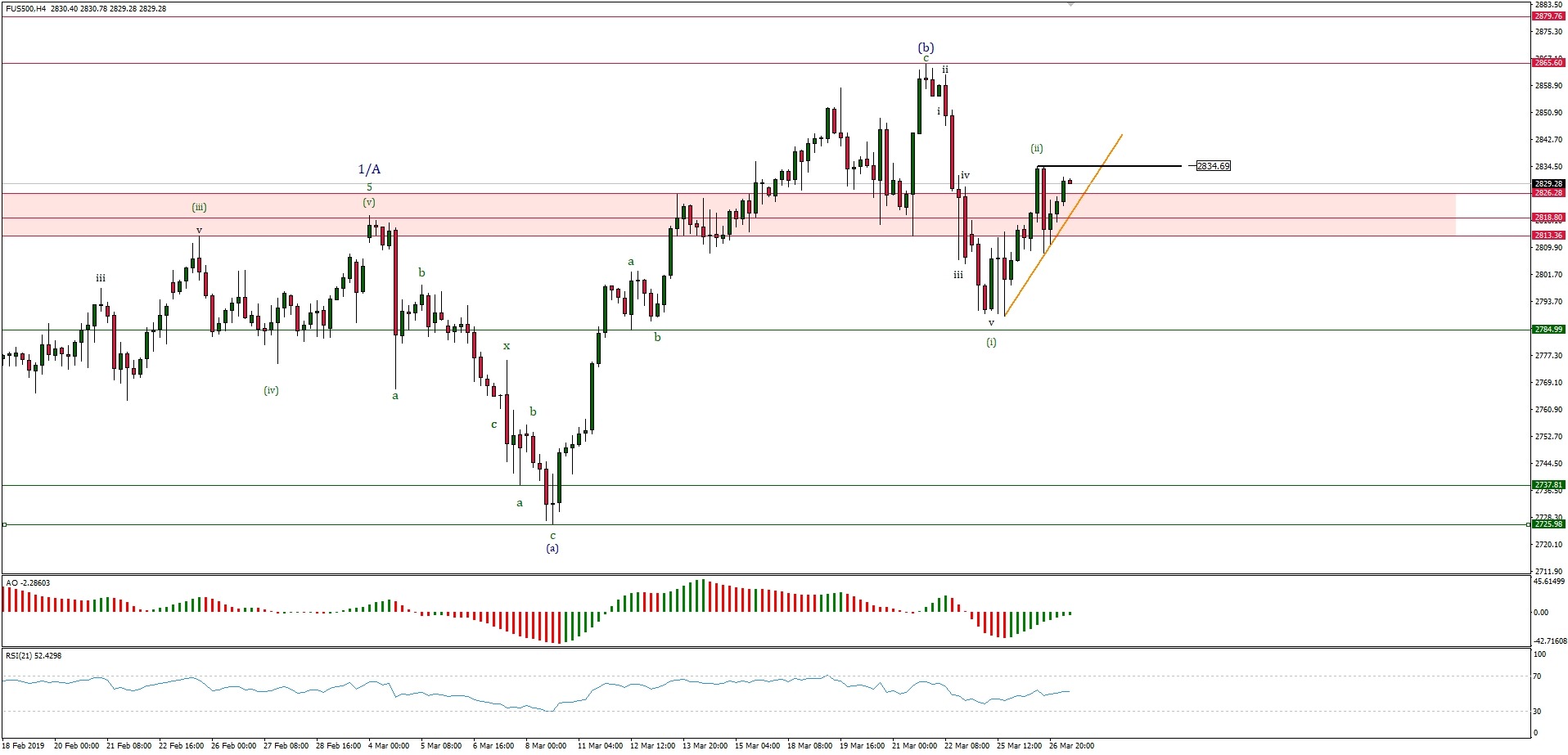 Na indeksie szerokiego rynku amerykańskiego SP500 zakończyła się fala impulsu oznaczona jako (i), a poziomem kończącym spadki okazał się poziom 2793, który leży tuż powyżej wsparcia technicznego na 2784. Obecnie rynek jest w fazie korekty wzrostowej fali (ii), która mogła zostać zakończona na poziomie 2834 i w tym wypadku fala (ii) byłaby korektą prostą. Potwierdzeniem tego założenia będzie wybicie przez rynek lokalnej linii trendu wzrostowego, a następnie wybicie poziomu lokalnego wsparcia na 2808. Oczywiście oba ruchy muszą być wykonane w sposób impulsywny, aby można było mówić o kontynuacji cyklu spadkowego w fali (c).