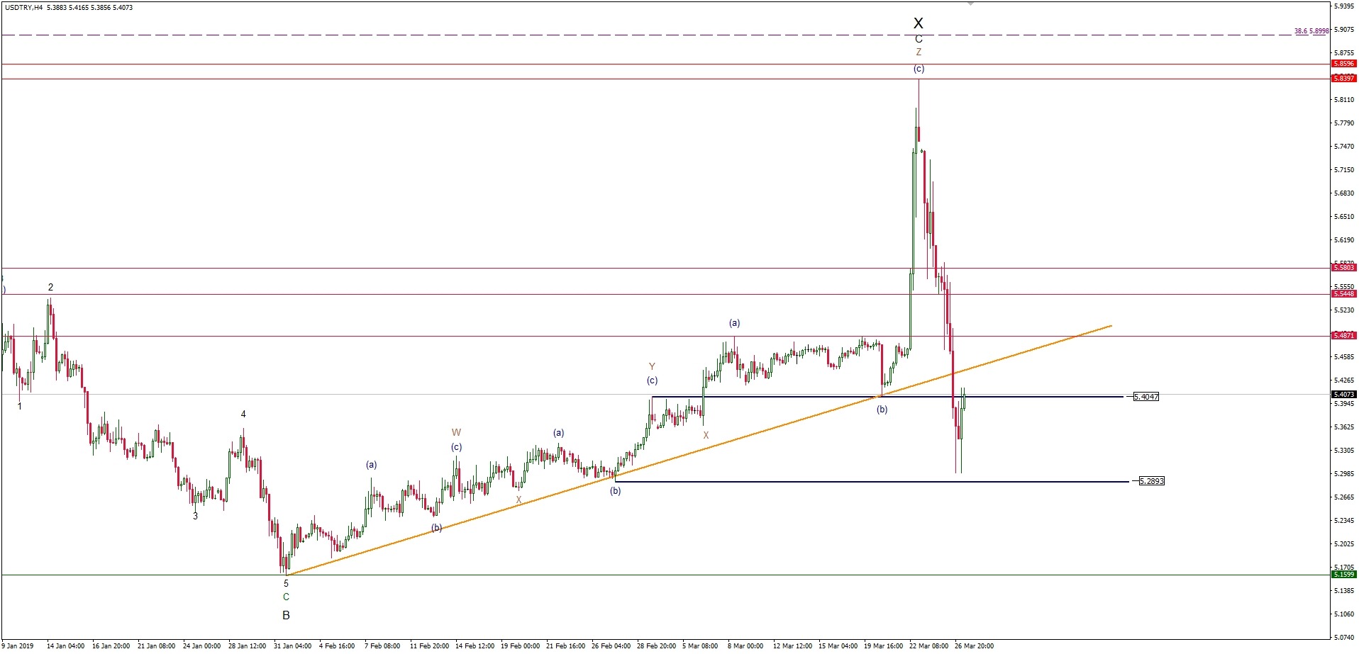 Impulsywne spadki nie ustają na rynku USD/TRY, na którym cena ostatnio wybiła poziom wsparcia na 5.4047 a zaraz po tym wydarzeniu zeszła jeszcze niżej w kierunku poziomu 5.2893, który jest również poziomem wsparcia technicznego. Wzrosty na razie mają charakter jedynie korekcyjny, gdyż testowany jest poziom 5.4047 od dołu a być może testowana będzie również linia trendu wzrostowego (również od dołu), tak więc zasięg wzrostów nie powinien przekroczyć poziomu 5.4585. W najgorszym razie ponownie wytestowany będzie przez rynek poziom oporu technicznego na 5.4871, z którego poziomu powinno wystąpić odwrócenie korekty wzrostowej i powrót do cyklu spadkowego. Pierwsza fala spadkowa 1/A w tym cyklu wygląda na zakończoną, wobec czego teraz jesteśmy w fali korekty wzrostowej 2/B. Po zakończeniu korekty wzrostowej rynek będzie realizował cykl spadkowy 3/C, a poziomem docelowym dla tego cyklu będzie dołek fali B wyższego rzędu na poziomie 5.1599.