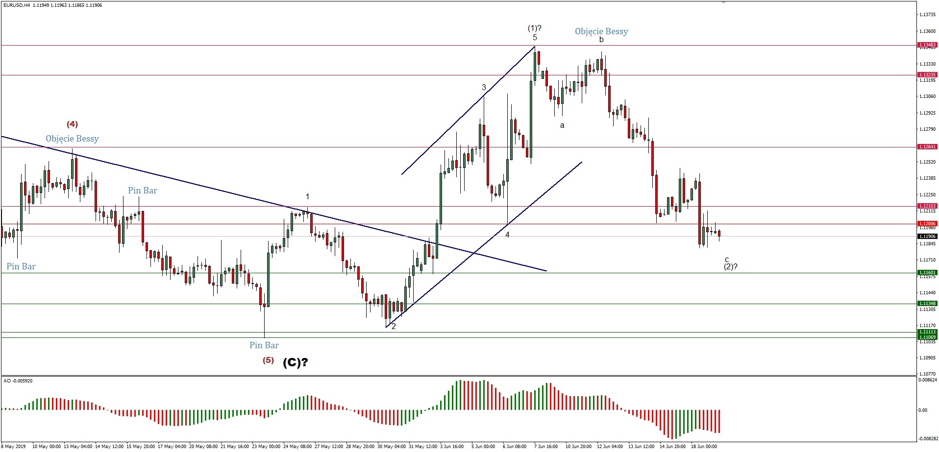 Ze względu na to, że para walutowa GBPJPY w swoim ostatnim ruchu spadkowym wybiła poziom 136.52, który miał być poziomem docelowym dla fali (b) korekty, impulsywny licznik spadkowy został nieco zmieniony. Przesunięciu w dół uległy fala 3 i fala 4, co oznacza, że fala 3 była impulsem rozciągniętym, a więc fala 5 będzie krótkim impulsem spadkowym. Cena nadal porusza się w kanale falowym między falami 3 oraz 4 i wykonała nawet nowy lokalny dołek na poziomie 135.71. Tam też została wyrysowana formacja świecowa Objęcia Hossy, więc widać, że strona popytowa walczy nadal przynajmniej o jakieś w miarę silne odbicie. Tego rodzaju ruch może się zrealizować już wkrótce, gdyż do zakończenia fali 5 brakuje jednej podfali spadkowej, więc jest bardzo duża szansa na jakieś korekcyjne odbicie. Oczywiście, ograniczenia są silne: pierwszym poziomem oporu jest ostatni dołek fali 3 na 136.57 a następnym poziom szczytu fali 4 na 138.32. Warto również zwrócić uwagę na budującą się dywergencję pozytywną pomiędzy wskaźnikiem momentum a ceną, co stanowi kolejną wskazówkę co do bliskiego zakończenia fali 5 spadkowej.