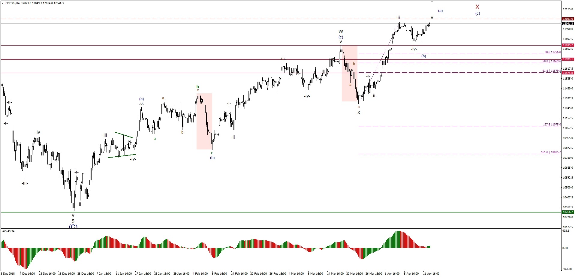 Wszystko wskazuje na to, że niemiecki indeks DAX jest również bliski zakończenia wzrostów i będzie to również oznaczało koniec ostatniej fali impulsu, czyli fali (v). Ponadto, również i na tym rynku jest widoczna dywergencja negatywna pomiędzy falą trzecią i piątą, co jak wiemy jest typowe dla tego typu ruchów falowych i stanowi dodatkową zapowiedź nadchodzącej korekty spadkowej. Na razie celem dla byków jest poziom 12,083 i tam może zakończyć się fala (a) wyższego rzędu. Po zakończeniu tej fali powinniśmy się na stawić na pojawienie się fali (b) korekty spadkowej, która na razie nie ma zaplanowanej jakiejś konkretnej formy ani czasu trwania i w zasadzie może być dowolną formą korekty, zarówno prostą, jak i złożoną. Wiadomo natomiast, że korekta spadkowa fali (b) nie powinna przekroczyć poziomu dołka fali X, czyli 11,218, gdyż wtedy licznik wzrostowy ulegnie unieważnieniu. Na koniec dodam jeszcze, że na indeksie DAX nadal panuje pozytywny sentyment a średnioterminowy scenariusz wzrostowy został zapoczątkowany 28 grudnia 2018 roku i jest nadal aktualny.