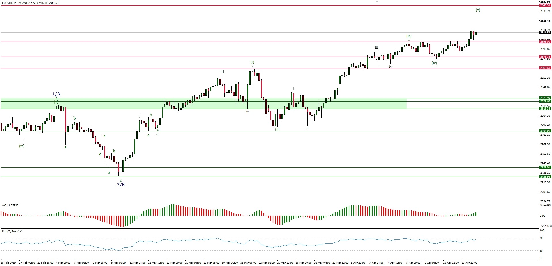 Indeks szerokiego rynku SP500 zdołał wybić poziom oporu technicznego na 2899 punktów, z którym zmagał się cały zeszły tydzień i ustanowił nowy lokalny szczyt na poziomie 2914 punktów. Ponowiony ruch wzrostowy nie ma już takiej siły i takiego pędu jak dotychczasowe fale wzrostowe, co widać po rozkładzie momentum w czasie trwania tego ruchu: pomimo utworzenia kolejnego szczytu cenowego, momentum jest mniejsze niż na poprzednich falach wzrostowych a warunki rynkowe już są wykupione. Oznacza to, że jest coraz większe prawdopodobieństwo zakończenia krótkoterminowych wzrostów na poziomie docelowym 2945 punktów, gdyż jest to ostatnia fala wzrostowa w tym cyklu impulsywnym. Typowe dla tej fali jest tworzenie dywergencji spadkowej pomiędzy falą trzecią i piątą, zupełnie jak to się dzieje na obecnym rynku. Po zakończeniu fali (v) można spodziewać się większej korekty spadkowej, ale jej zakres zostanie wyznaczony w kolejnych analizach.