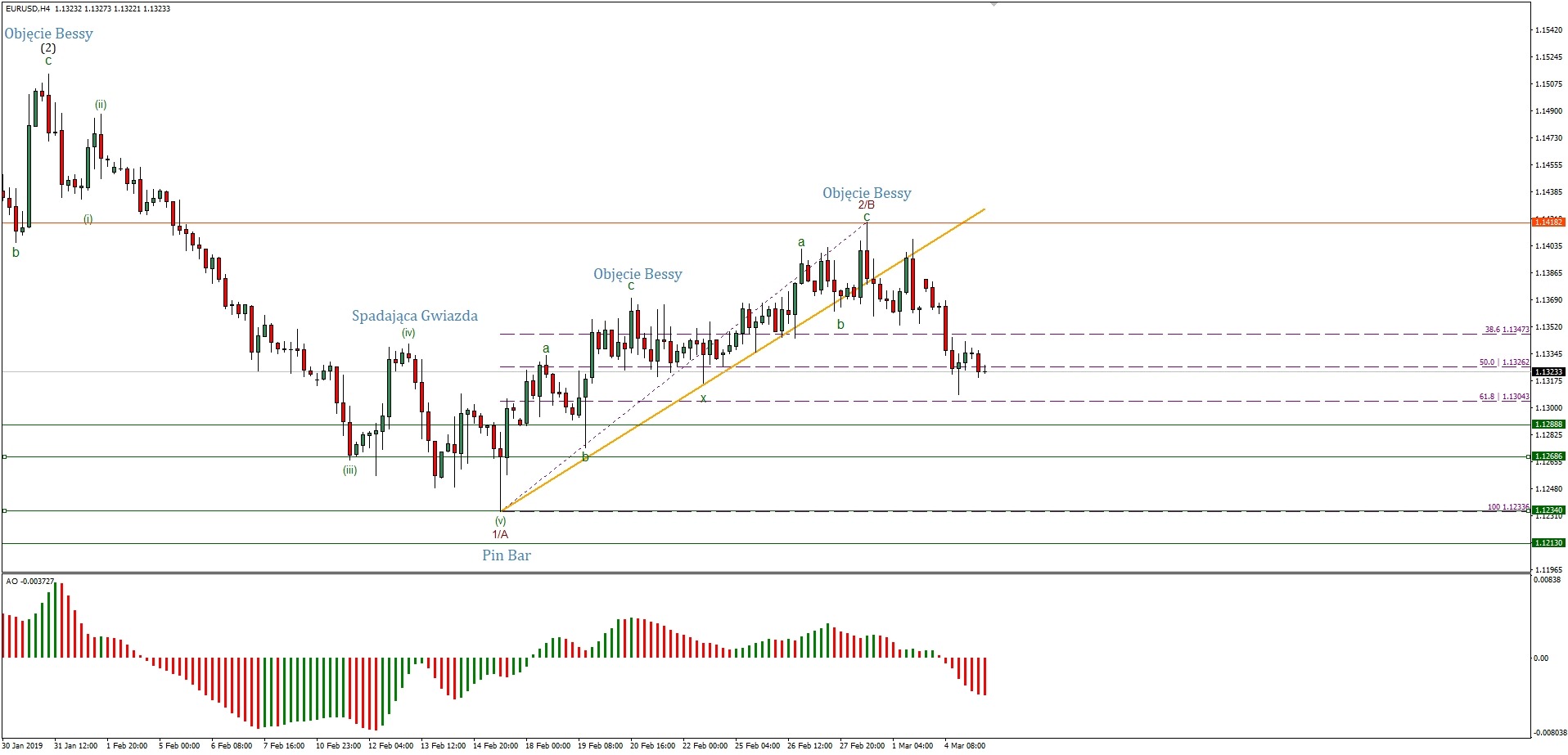 Para EUR/USD po dotarciu do poziomu 61% Fibonacciego na poziomie 1.1407 zaczęła spadać i wybiła dołem krótkoterminową linię trendu wzrostowego zaznaczoną na wykresie kolorem pomarańczowym. Od tamtej pory fala spadkowa zdołała wybić 50% zniesienia Fibonacciego położonego na poziomie 1.1326 i aktywnie zmierza w kierunku 61% zniesienia Fibonacciego zlokalizowanego na poziomie 1.1304. Spadki wyglądają na dość impulsywne i tak długo, jak poziom 1.1357 jest nienaruszony możemy założyć, że trend spadkowy jest kontynuowany. Następnym poziomem docelowym dla niedźwiedzi byłby poziom wsparcia technicznego zlokalizowany na 1.1288, a nawet jeden poziom niżej na 1.1263. Wybicie dołka fali A zlokalizowanego na poziomie 1.1234 ostatecznie potwierdzi szczyt fali 2/B na 1.1418.