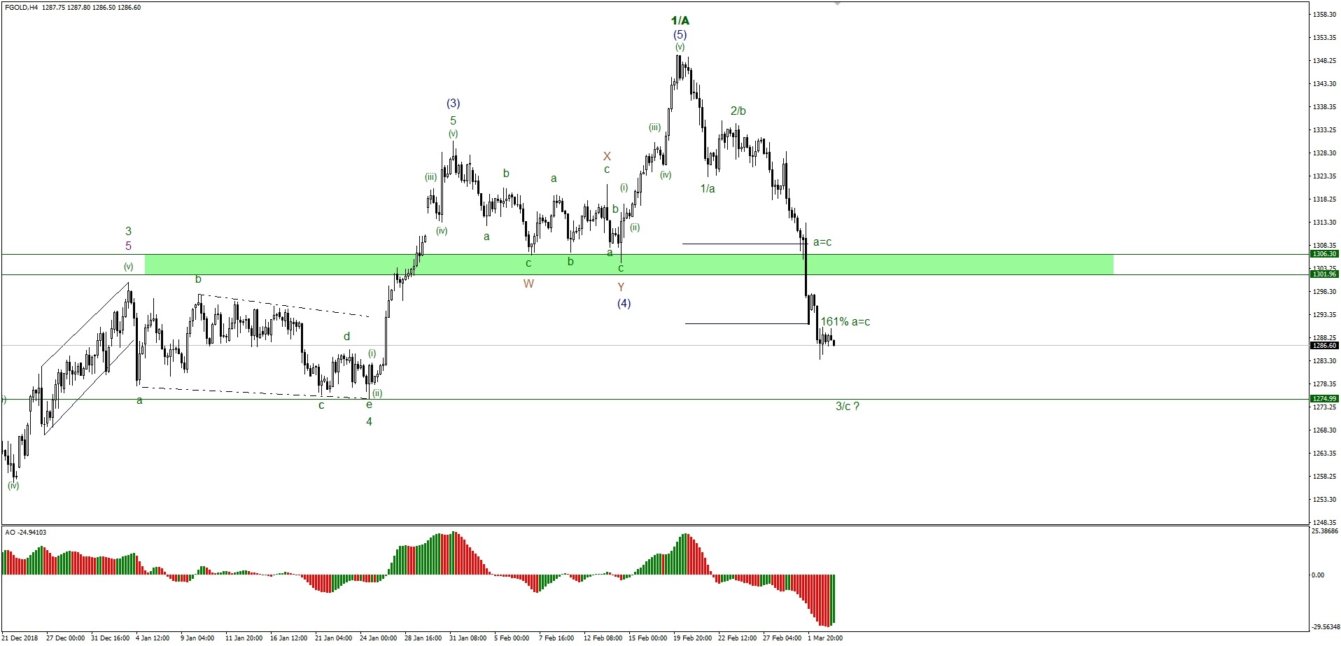 Na Złocie kwotowanym do dolara spadki przybrały gwałtowny i impulsywny charakter, wobec czego poziom równości geometrycznej fal a i c na $1,308 został wybity. Identycznie stało się ze strefa wsparcia technicznego między poziomami $1,301 – $1,306, która również została widocznie naruszona. Nawet poziom geometryczny 161% a = c na $1,291 został potraktowany przez rynek bez pardonu, co jednocześnie oznacza, że spadki będą kontynuowane, a poziomem docelowym jest $1,274. Jest to poziom dołka poprzedniej korekty spadkowej wyższego rzędu i najprawdopodobniej zostanie osiągnięty już podczas dość sporej dywergencji wzrostowej, która będzie sygnałem do zakończenia pierwszej fali spadków.
