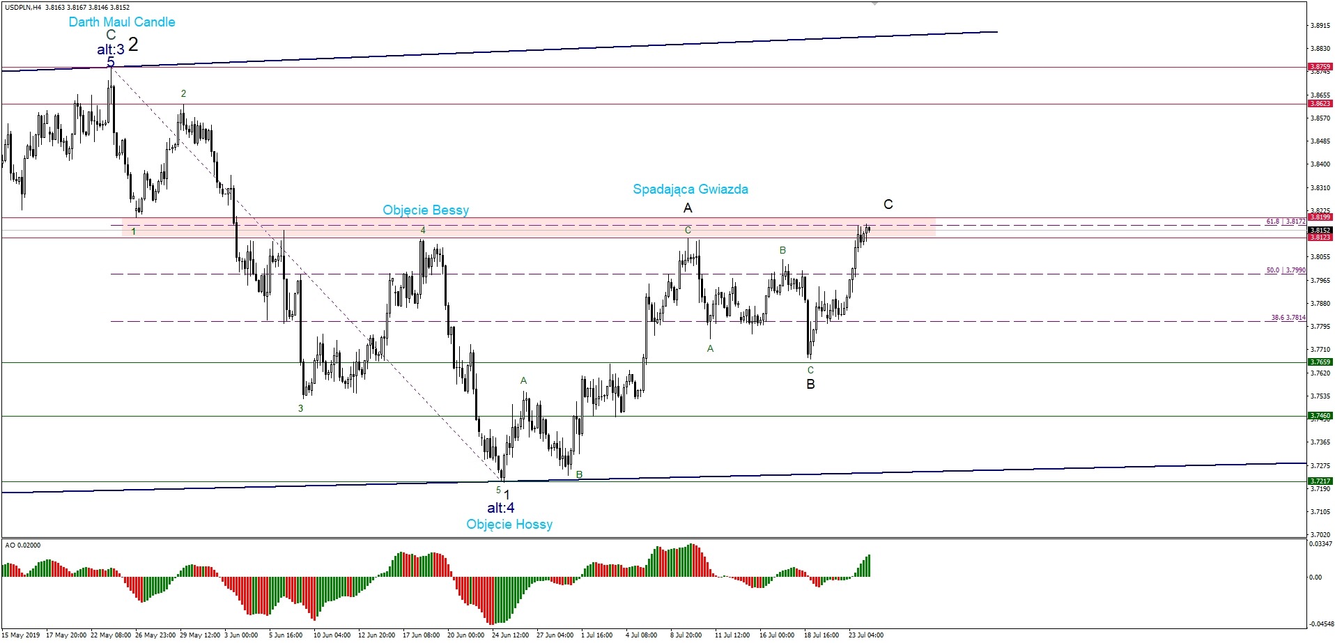Po wykonaniu fali wzrostowej oznaczonej na wykresie jako A, kurs USDPLN zaczął spadać w kierunku niżej położonych poziomów wsparcia. Główny poziom wsparcia na 3.7659 nie został jednak naruszony pomimo wykonania przez rynek trójfalowej korekty spadkowej ABC. Dołek na poziomie 3.7672 został oznaczony jako dołek fali B wyższego rzędu i stamtąd też byki postanowiły zaatakować po raz kolejny. Dzięki temu manewrowi korekta wzrostowa fali 2 zaczęła wydłużać się w czasie i obecnie znajdujemy się znowu na poziomie 61% zniesienia Fibonacciego zlokalizowanym na 3.8172. Jak tym razem zostanie rozegrane to zniesienie oraz znajdujący się nad nim poziom oporu technicznego (3.8199), to przekonamy się wkrótce. W wypadku silnego wybicia powyżej poziomu oporu technicznego możliwe jest wydłużenie wzrostów nawet do poziomu 3.8623, który znajduje się tuż poniżej poziomu oporu technicznego z marca 2019 na 3.8759. Dopiero wybicie tego poziomu unieważni długoterminowy scenariusz spadkowy, wiec pomimo potencjalnych wzrostów w fali C ku wyższym poziomom cenowym, są one nadal rozpatrywane jako cykl korekcyjny.