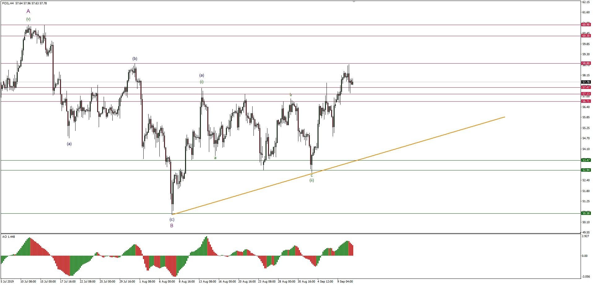 Kurs Złota w ciągu ostatnich tygodni wzrósł to poziomu $1,564 i właśnie ten poziom został oznaczony jako szczyt fali (v) niższego rzędu oraz szczyt fali (5) wyższego rzędu. Oznacza to, że trend wzrostowy rozpoczęty pod koniec maja 2019 roku jest już dojrzały i teraz nadeszła pora na korektę spadkową. Pierwsza fala korekty spadkowej mogła już zostać wykonana w formie korekty nieregularnej abc zielone, z dołkiem na poziomie wsparcia technicznego na $1,489 – $1,486. Ponieważ nadal nie jest jasne, czy ta fala spadkowa to koniec korekty w fali 4 wyższego rzędu, czy też tylko podfala A korekty, warto obecnie obserwować ten rynek, by sprawdzić, w jakim kierunku będzie się poruszać następna fala oraz jaki będzie miała charakter. Wskazówkami sygnalizującymi, że ta korekta spadkowa nie jest jeszcze zakończona w pełni a jest jedynie podfalą A jest brak overbalance na wykresie: korekta fali A jest typową korektą obserwowaną w tym trendzie wzrostowym, zarówno pod względem czasu, jak i ceny. Aby overbalance wystąpił, niedźwiedzie powinny zepchnąć cenę jeszcze niżej, w kierunku poziomu $1,480.