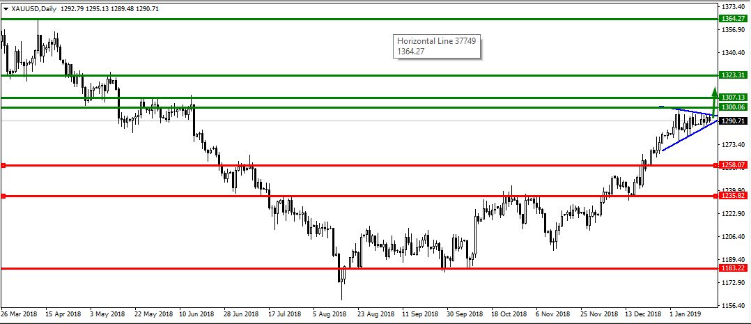 Dodatkowo nad dalszymi wzrostami na kursie złota ciąży panująca na rynkach polityczna niepewność. Po pierwsze częściowe zamknięcie rządowych instytucji w USA trwa już 27 dzień z rzędu i jak na razie nie widać wyjścia z panującego impasu. Przedłużający się ,,shutdown” może negatywnie się odbić na dynamice wzrostu gospodarczego w I kwartale. Totalną niewiadomą mamy też odnośnie nadchodzącego pod koniec marca „Brexitu”. Na stole pozostają aż 4 możliwe scenariusze wyjścia po tym jak premier Theresie May ledwo co udało się zdobyć wotum zaufania po kompletnej klapie, jaką było głosowanie w brytyjskim parlamencie nad jej porozumieniem z Unią Europejską. Dopóki więc te problemy nie zostaną więc w jakiś rozsądny sposób rozwiązane, dopóty możemy mieć problem z przebiciem psychologicznego poziomu 1300 dolarów.