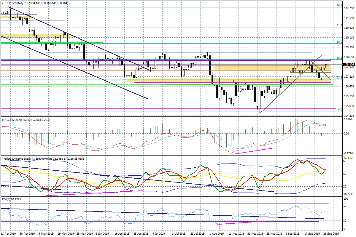 Na koniec tygodnia spójrzmy na wykres USDJPY, który jest też wypadkową nastrojów wokół ryzykownych aktywów. Widoczne ocieplenie na rynkach akcji po korekcie wywołanej obawami o impeachment Donalda Trumpa, przełożyło się dzisiaj na powrót notowań tej pary ponad poziom 108,00. Nie wyklucza to podejścia pod szczyt z 18 września przy 108,47, ale ruch ten będzie miał miejsce przy dywergencji na dziennych wskaźnikach, co może sugerować, że nie będzie trwały.