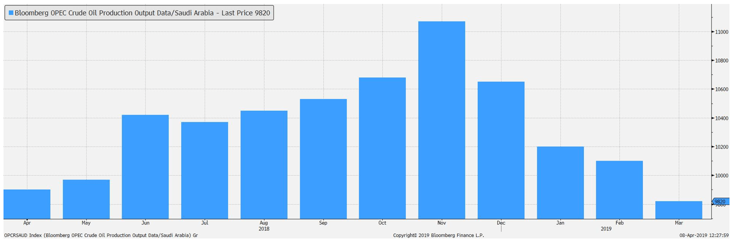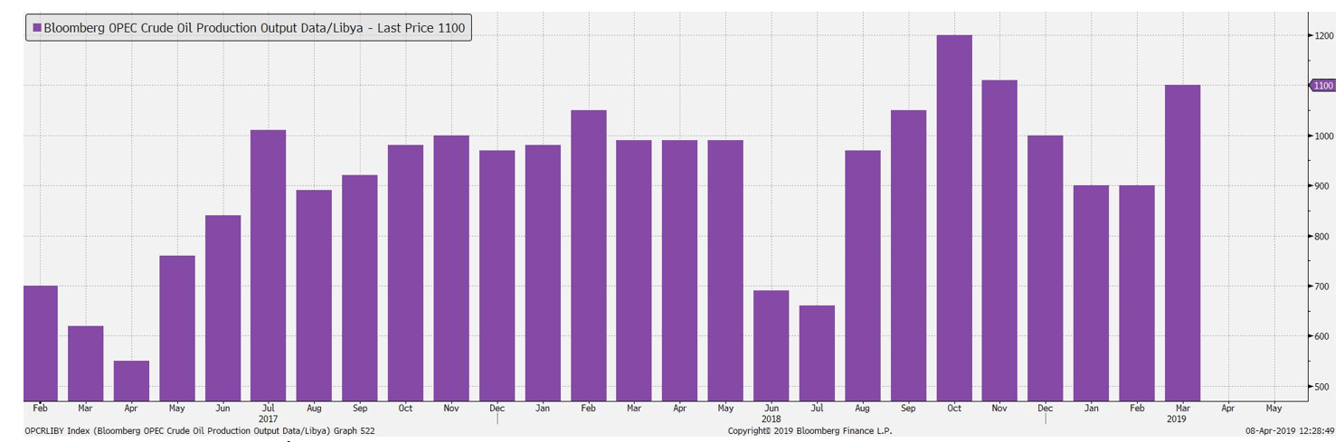 Utrzymanie dziennej produkcji na poziomie 1,1 mln baryłek jest poddawane pod wątpliwość ze względu na ofensywę sił partyzanckich w kierunku Trypolisu. Potencjalne przerwanie dostaw z tego kraju skutkowałoby zwiększeniem groźby deficytu surowca. Ważną kwestią jest także przedłużenie wyjątków od sankcji na Iran – wygasną one na początku maja. Z jednej strony USA chciałyby dalej ograniczać eksport z tego kraju. Z drugiej strony Donald Trump chciałby niższych cen paliw i w powietrzu wiszą kolejne próby wywierania nacisków na OPEC.