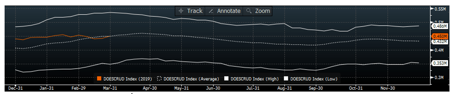 Sezonowość zapasów ropy w USA. Źródło: Bloomberg