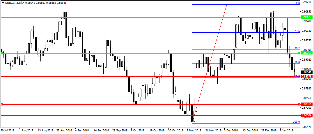 Kurs EURGBP walczy obecnie z poziomem wsparcia w okolicy 0,8830 będącym 61,8% zniesieniem Fibonacci ruchu wzrostowego z listopada i grudnia ubiegłego roku. Po jego przełamaniu para mogłaby podążać w kierunku zeszłorocznych wsparć w rejonach 0,8730 oraz 0,8690. W przypadku nieudanego przebicia poziomu 0,8830 kurs EURGBP mógłby wzrosnąć ponownie w rejon 0,8920-0,8950.