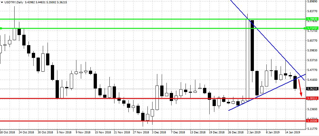 Turecka lira umocniła się prawie 1 procent do dolara po tym, jak bank centralny Turcji pozostawił stopy procentowe bez zmian ale zapowiedział, że w razie potrzeby zacieśniłby politykę pieniężną. Para USDTRY wyłamała się dołem z tworzącej się od początku roku formacji trójkąta i ma teraz otwarta drogę w stronę tegorocznych minimów w pobliżu poziomu 5,30.