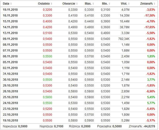 Spoglądając na kurs Getinu, panikę widać również na kursie akcji spółki. W przeciągu roku, akcje uległy przecenie o 79,22%, z czego w ciągu ostatniego tygodnia zaliczyliśmy dwie konkretne sesje na ponad -17%.