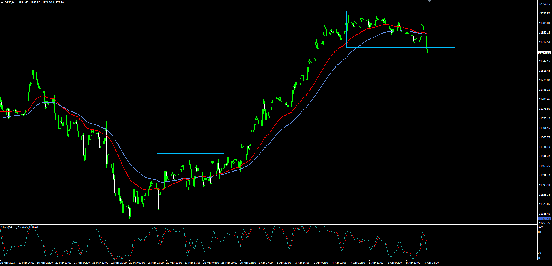 Wróćmy zatem do wczorajszego artykułu i naszego scenariusza. Wypełnił nam się drugi warunek do zajęcia pozycji krótkiej, czyli wyjście ceny ponad zasięg największej korekty w ostatnim impulsie. Jeżeli w dniu dzisiejszym nie wrócimy stale ponad górną krawędź układu Overbalance (11 897), będziemy najprawdopodobniej obserwować dalsze spadki. Patrząc na ostatnie ruchy niemieckiego indeksu, istnieje szansa, że spadki przybiorą dynamiczny charakter.
