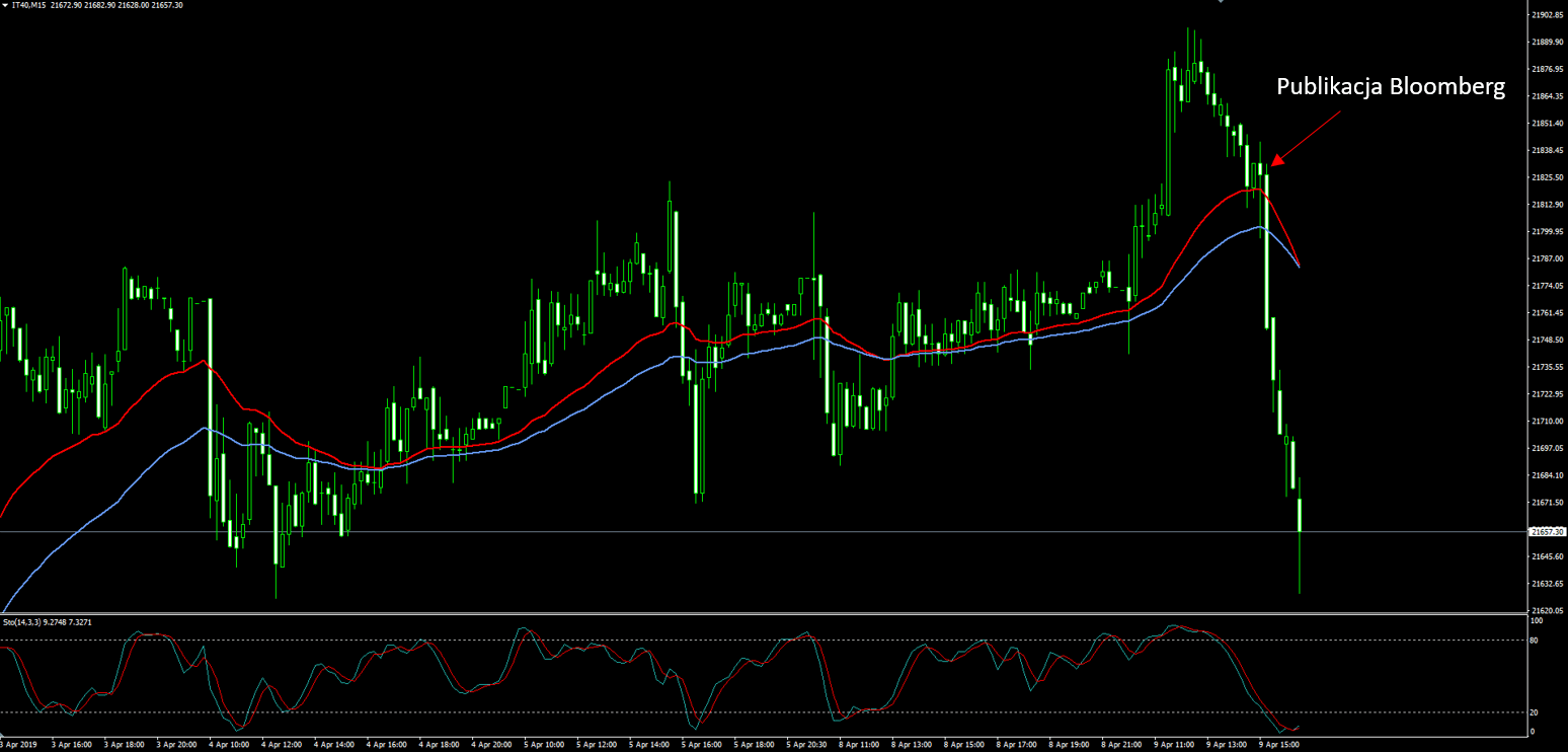 Dzisiejszym motywem zapalnym dla światowych rynków akcji okazała się publikacja Bloomberga. Zdaniem agencji, włoski rząd ogłosi rewizję głównych wskaźników makroekonomicznych, tj. PKB na ten rok z 1% ma wynieść 0.1% oraz podniesiona zostanie prognoza deficytu budżetowego do 2.5%. W ciągu ponad półtorej godziny od publikacji, włoski indeks FTSE MIB stracił ponad 0.8% co czyni go jednym z najgorzej radzących sobie indeksów w Europie.
