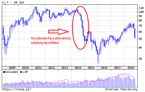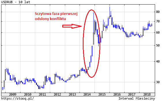 Rozpoczyna się spadek cen ropy naftowej. Ze 100 USD za baryłkę w lipcu, do 45 USD w styczniu 2015 roku. Wtedy również rozpoczyna się coraz większa eskalacja konfliktu. Inwestorzy zaniepokojeni pogłębiającym się konfliktem zaczynają wyprzedawać rosyjską walutę. Rubel z każdym dniem traci coraz bardziej. Pod koniec 2014 roku kurs spada do okolic 78 rubli za dolara. Niby strach inwestorów przed ryzykiem, ucieczka przed widmem wojny. A tak naprawdę, osłabienie rubla pozwoliło zrekompensować Putinowi straty w budżecie wywołane spadkiem cen ropy naftowej. Jako eksporter surowca, Rosja osiągała znaczne korzyści ze słabej waluty. Zatem wzrost napięcia na wschodzie Ukrainy był na rękę Putinowi. Im większa eskalacja działań, tym większe osłabienie rubla. Im rubel słabszy, wpływy do budżetu ze sprzedaż ropy większe. Rachunek prosty. Pytanie, czy przypadkowy? Czy może działanie zbrojne były wyreżyserowane i inspirowane przez Moskwę, w celu realizacji takiego scenariusza?