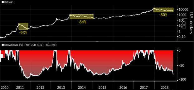Wszystkie 9 kryptowalut o kolejnej, największej kapitalizacji traci też dziś mocno na wartości wraz z Bitcoinem, a więc krew leje się na całym wirtualnym rynku. Tegoroczną katastrofę, podczas której najpopularniejsza kryptowaluta straciła już od grudniowego szczytu ponad 80%, można porównać jedynie do 93% tąpnięcia z 2011 r. oraz znacznie dłuższej, 84% przeceny z lat 2013-2015 w wyniku której upadła tokijska giełda kryptowalut Mt. Gox. Natomiast w ujęciu kapitałowym obecna przecena jest znacznie bardziej dotkliwa dla inwestorów niż wszystkie poprzednie razem wzięte, gdyż rynek kryptowalut stracił od początku stycznia ponad 700 miliardów dolarów czyli więcej niż PKB niejednego, średniej wielkości państwa!