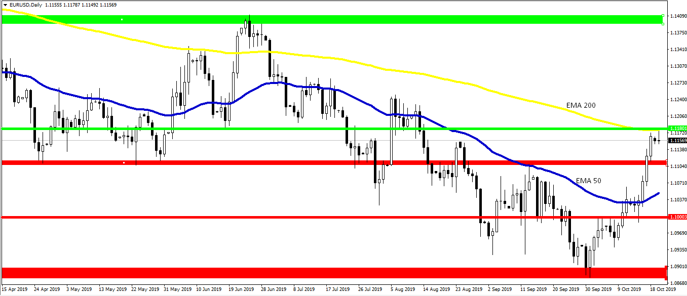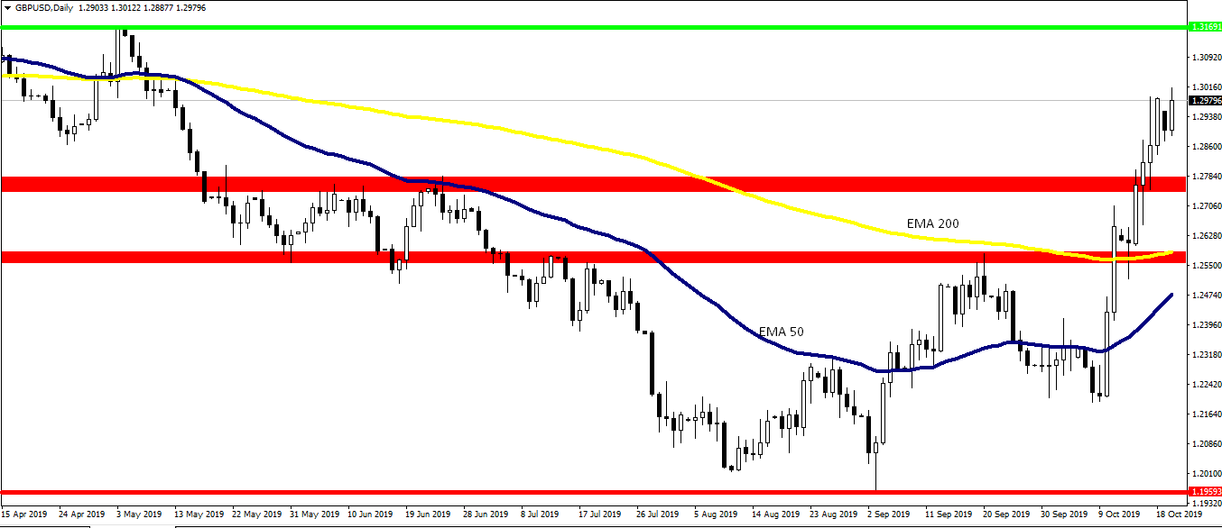 Polityczne zagrywki pewnie więc ponownie przesuną datę ,,deadline” dla Brexitu , ale z drugiej strony inwestorzy są coraz bardziej przekonani, że szanse na tzw. ,,twardy Brexit” bez umowy są znikome. Analitycy Goldman Sachs zmniejszyli dziś szanse takiego, najgorszego dla brytyjskiej gospodarki rozwiązania, do jedynie 5% wobec 10% przed zeszłotygodniowym porozumieniem.