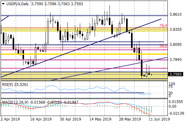 Na USDPLN ostatnie dwa dni też upłynęły pod znakiem prób odbicia, które przybrały formę świec doji z dużymi knotami od góry – to może sygnalizować siłę trendu spadkowego i prowokować do wybicia dołka 3,7525 i zejścia w okolice wsparcia 3,7385, które wyznaczają minima z marca b.r.