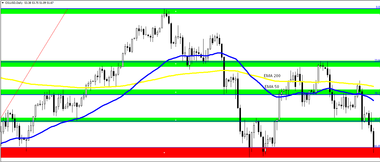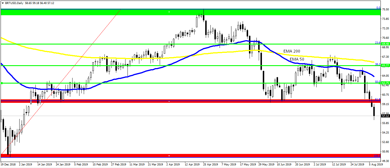 Z technicznego punktu widzenia kurs ropy WTI walczy obecnie z silną strefą wsparcia zlokalizowaną pod 61,8% zniesieniem Fibonacci fali wzrostowej trwającej od grudnia 2018 roku do kwietnia 2019 roku, ograniczoną od dołu dołkiem z czerwca na poziomie 50,60. Po jej ewentualnym przebiciu kurs miałby otwartą drogę w stronę minimów z grudnia 2018 roku na poziome 42,35. W przypadku braku siły na jej przebicie powinno nastąpić odbicie w stronę strefy oporu ograniczonej od góry poziomem 54,80.