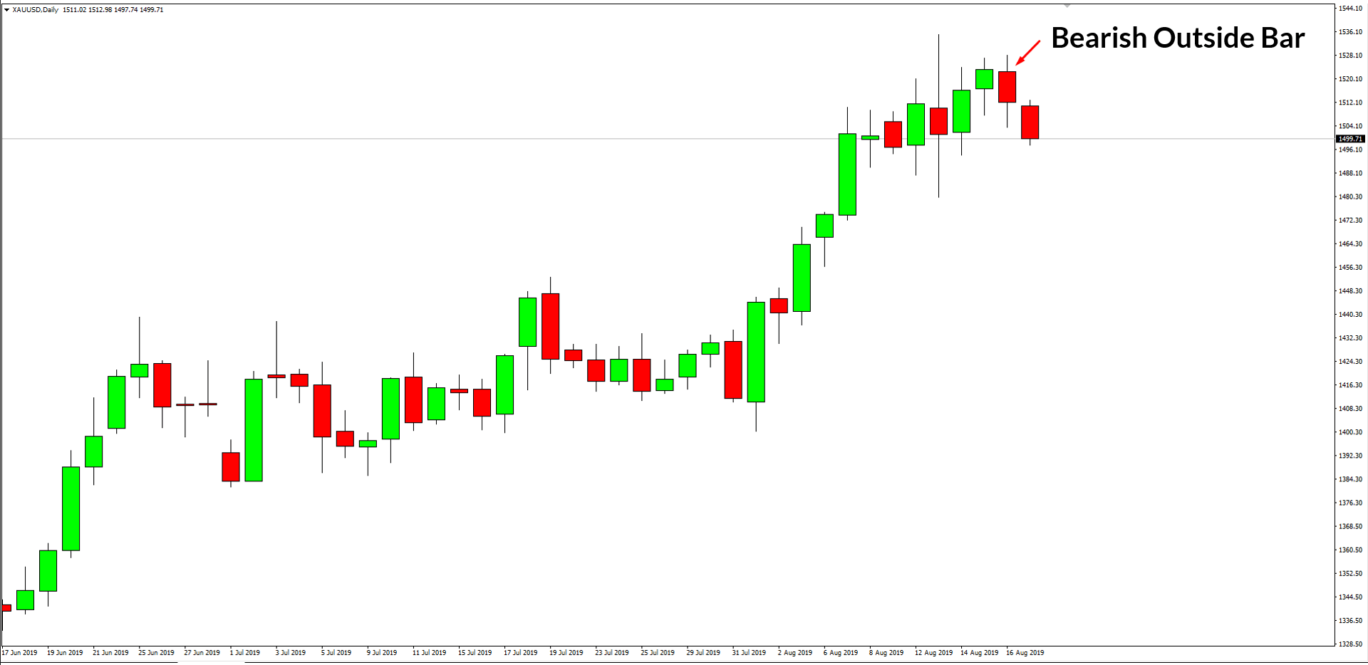 Dzisiejszy dzień dla cen złota może okazać się bardzo istotny ze względu na kontynuację piątkowej wyprzedaży co dałoby dodatkowe potwierdzenie formacji bearish outside bar na interwale dziennym.