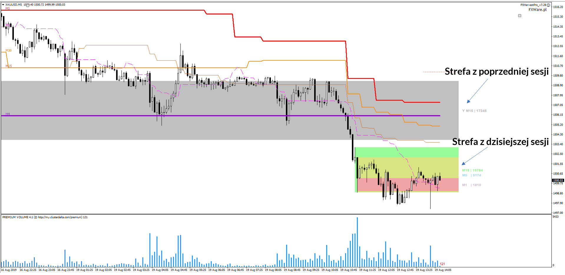 Na wykresie widzicie dwie strefy – jedną kolorową a drugą szarą. Szara jest wyznacznikiem strefy największego obrotu z poprzedniej sesji czyli w tym przypadku z piątku. Druga kolorowa to strefy największego obrotu z danej sesji czyli z dzisiaj.