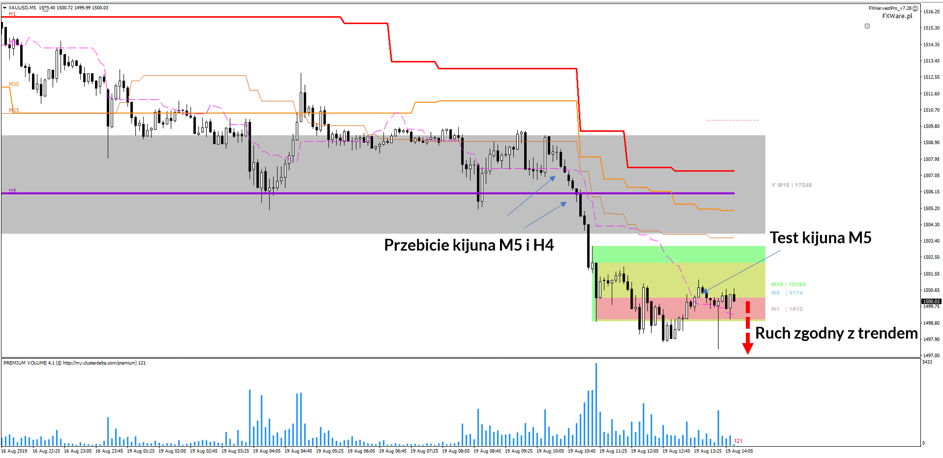 Przebicie kijuna H4 oraz M5, odejście ceny, powrót do M5 i dalszy ruch zgodny z trendem.