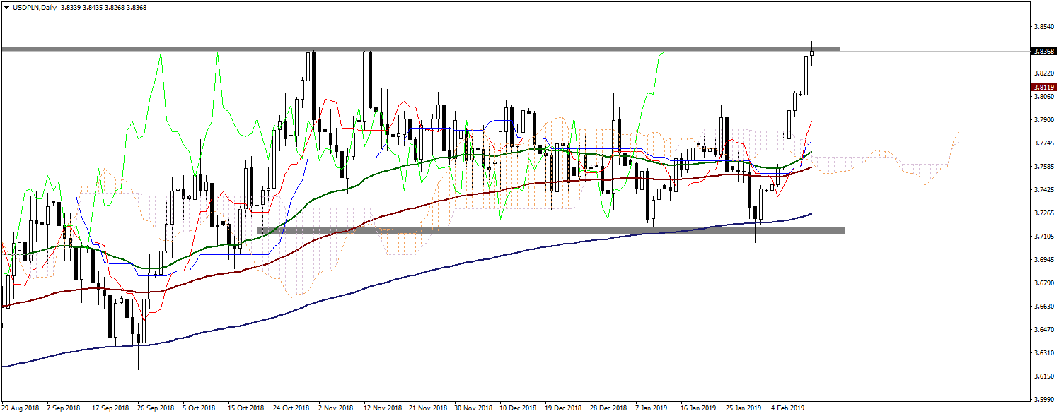 Waluta amerykańska jest faworyzowana w ostatnim czasie, a wczorajsza sesja wydłużyła serię wzrostowych świeczek na indeksie dolara. Dolar ponownie zaczął być preferowany po publikacji dobrego raportu z rynku pracy w USA, który podtrzymuje szansę na podwyżkę stóp procentowych w USA jeszcze w tym roku. Na tle innych gospodarek, amerykańska koniunktura prezentuje się w dalszym ciągu dość dobrze. Z drugiej strony utrzymująca się niepewność sprzyja walutom zaliczanych do grona bezpiecznych przystani, w tym USD. Skoro sentyment do USD jest dobry, to jak na razie należy trzymać się tego trendu. Dodatkowo wczoraj pojawiły się doniesienie, że w celu uniknięcia kolejnego zawieszenia pracy amerykańskiego rządu, Republikanom i Demokratom udało się osiągnąć porozumienie w kwestii finansowania muru na granicy z Meksykiem. Sprawa jednak pozostaje w toku, gdyż ustalenie obejmują jedynie finansowanie części wspomnianej bariery na granicy dwóch państw.