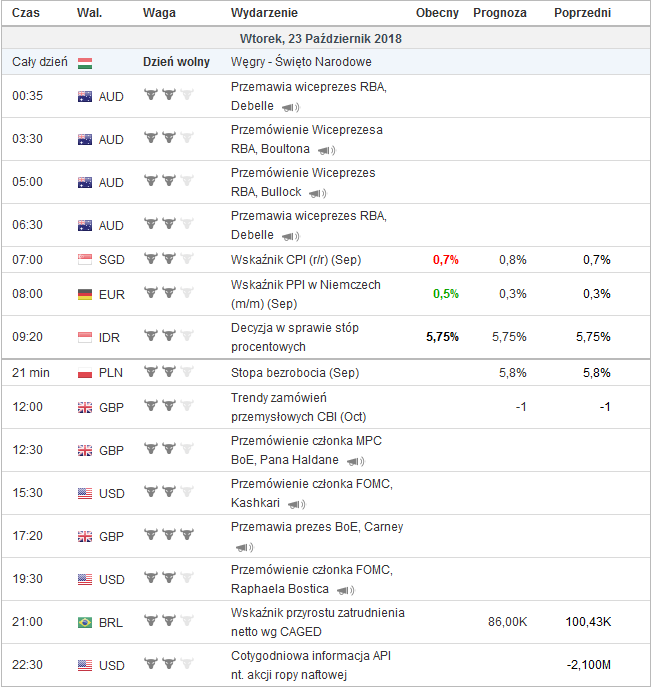 Włoski dług osiąga wartości nieakceptowalne przez Komisję Europejską. Zaplanowana na 26 października kolejna aukcja długu Włoch może spowodować, że Rada Europejska rozpocznie procedurę nadmiernego zadłużania w najnowszym planowanym budżecie Włoch. Tego samego dnia agencje S&P500 oraz Moody’s mają ocenić rating kraju. Oba te wydarzenia mocno wpłyną na określenie poziomu rentowności papierów skarbowych, które wskazują poziom kosztów obsługi długu państwa.