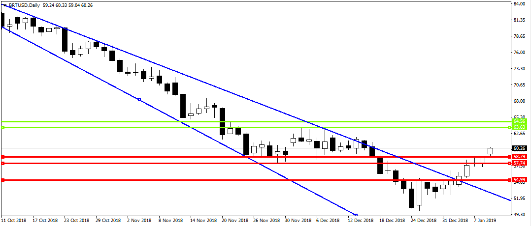 Ropa naftowa Brent przedłużyła o kolejny dzień swoją najdłuższą od półtora roku serię sesji wzrostowych, przebijając się powyżej psychologicznego poziomu 60$ za baryłkę, kilkanaście godzin po tym jak ropa naftowa WTI przebiła swój psychologiczny poziom 50$ za baryłkę. Oba gatunki ropy zyskują na wartości 8 dzień z rzędu, odzyskując siłę po spektakularnym 35% spadku w IV kwartale 2018 r.