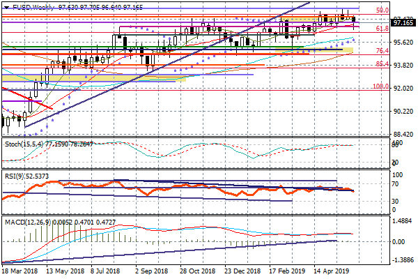 Wątek Meksyku podbija też notowania na nowojorskiej giełdzie, w połączeniu ze spekulacjami wokół bardziej „gołębiej” polityki FED. Te jednak zdaje się, że były ostatnio nieco na „wyrost” i wczoraj dolar już nie tracił, a odbijał. Dobrze to widać po zachowaniu się koszyka dolara FUSD, który obronił wsparcie przy 96,85 pkt., chociaż chwilowo je naruszył (minimum 96,64 pkt.). Wsparciem stał się odczyt indeksu ISM dla usług, który przykrył słabe dane ADP. Zresztą oba subindeksy zatrudnienia w ISM (przemysłowym i usługowym) wypadły w maju lepiej, co zmniejsza ryzyko rozczarowania jutrzejszymi danymi Departamentu Pracy USA.