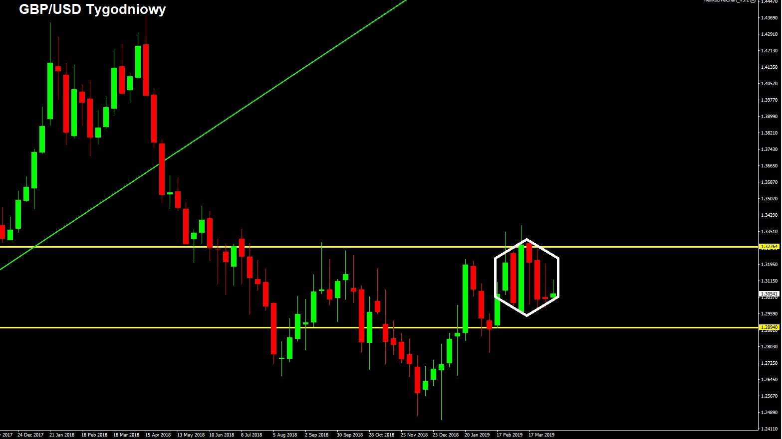 Opis pary: GBP można powiedzieć brak tętna. Jest to spowodowane nie tylko brakiem wydarzeń ekonomicznych, ale również faktem, że znajdujemy się w samym środku konsolidacji pomiędzy 1.2900, a 1.3300.