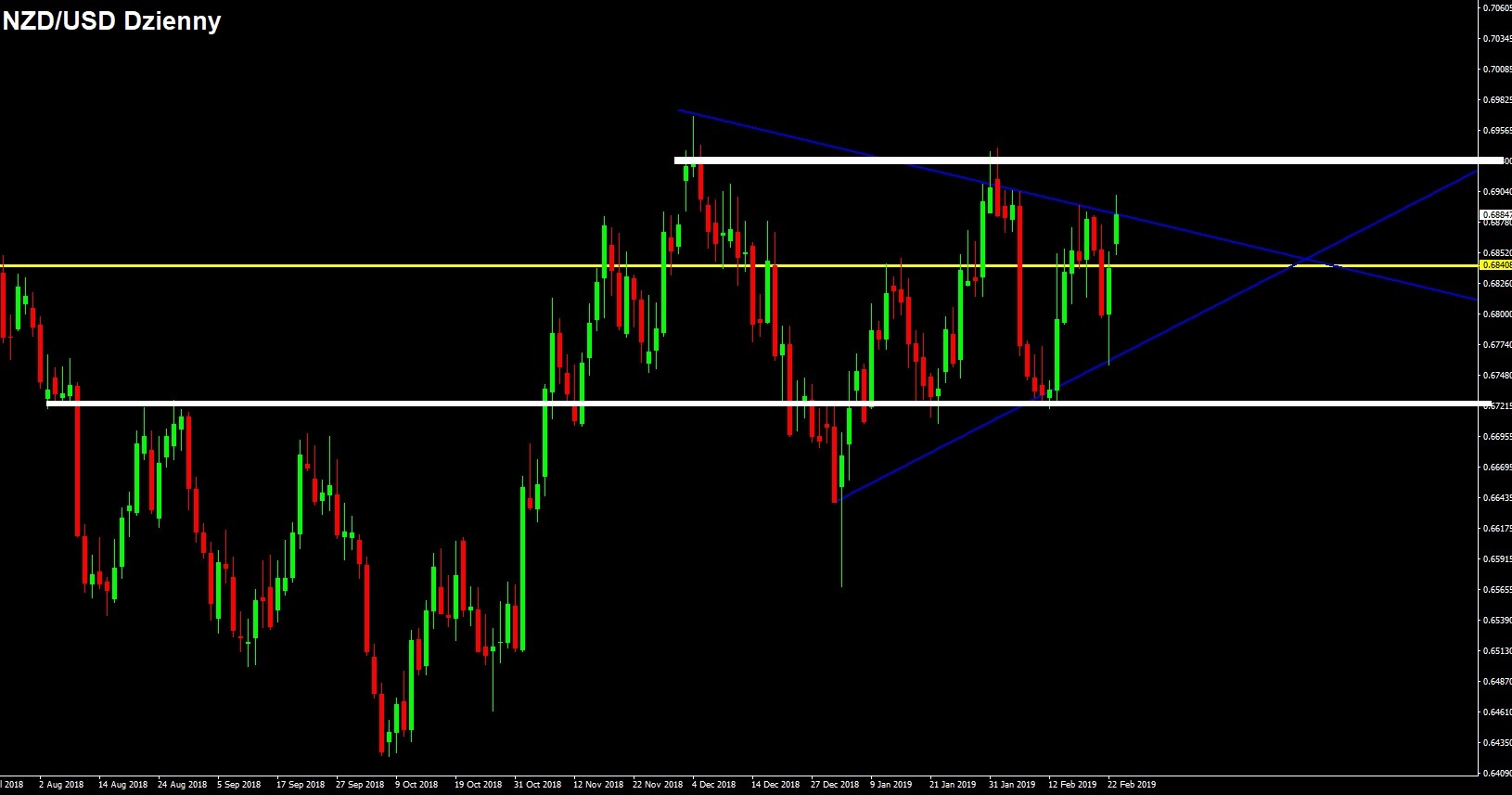 Opis pary: W ostatnich artykułach zwróciłem Państwa uwagę, że NZD znajduje się w konsolidacji. Myślę, że docelowo wielu graczy może widzieć na wykresie dziennym formacje trójkąta. Osobiście rozczytuje to troszkę inaczej. Przy każdej takiej formacji możemy wskazać główny poziom wsparcia i oporu (proszę zerknąć na wykres). Przebicie poziomów 0.6950 utwierdziłoby byki co do średnioterminowego trendu wzrostowego i otworzyło docelowo drogę do testu 0.7120.