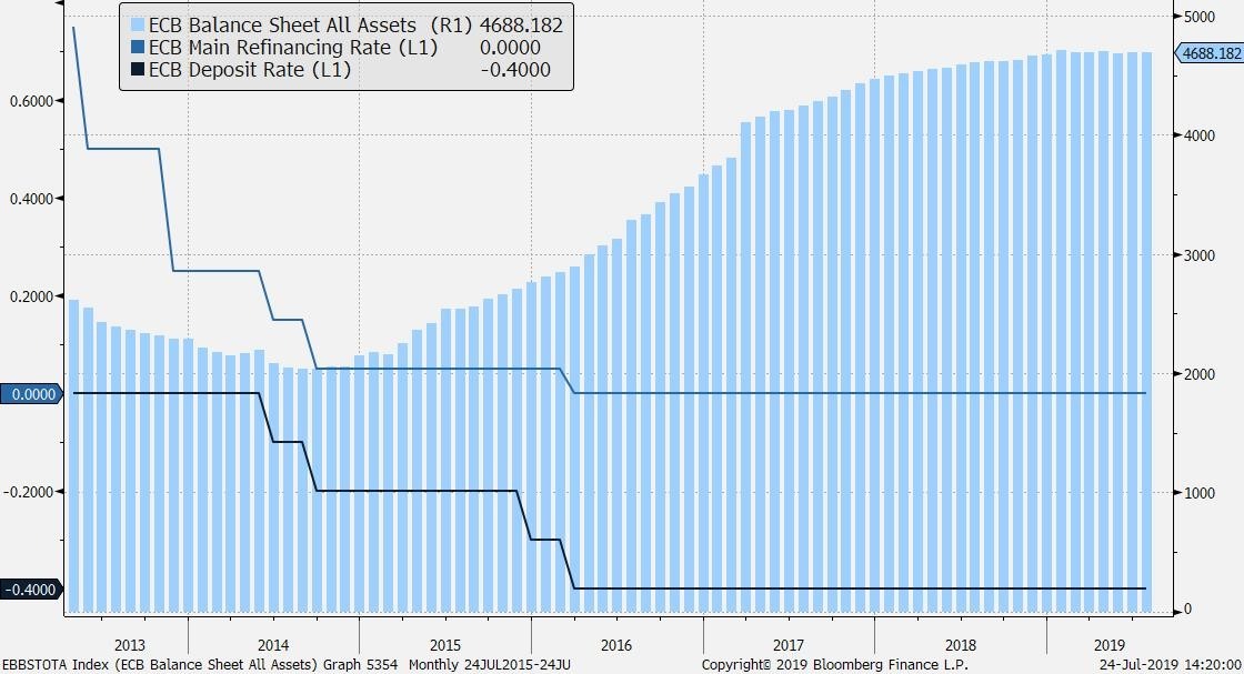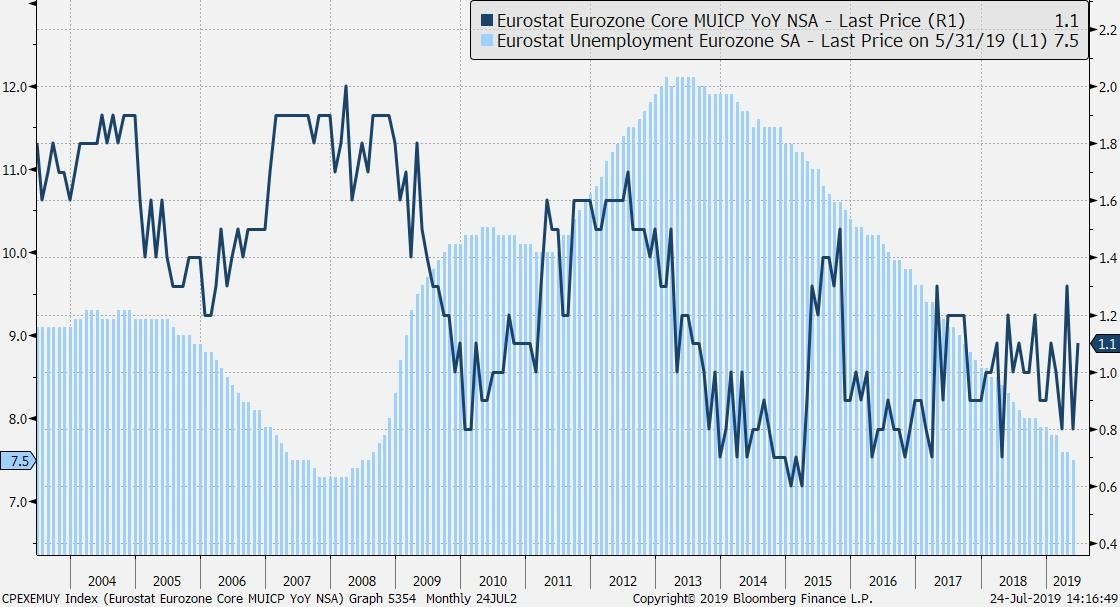 W ostatnich wystąpieniach publicznych Mario Draghi, Prezes EBC oraz Phillip Lane, Główny Ekonomista sugerowali gotowość do sięgnięcia po szeroki pakiet instrumentów luzujących politykę w przypadku braku poprawy sytuacji gospodarczej. Również protokół z ostatniego posiedzenia potwierdza, że w Radzie Prezesów jest zgoda co do potrzeby dodatkowego wsparcia gospodarki z wykorzystaniem wszystkich dostępnych instrumentów. Seria ostatnich, jednoznacznie słabych danych bez wątpienia dostarcza argumentów zwolennikom luzowania. Jednocześnie, sytuacja makroekonomiczna nie jest na tyle alarmująca by decydować się na luzowanie już w lipcu. Przede wszystkim mocny pozostaje rynek pracy.