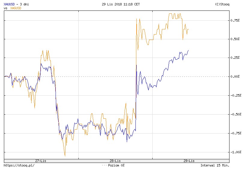 Wczorajsze rewelacje w większym stopniu wpłynęły na cenę srebra lecz patrząc na stopę zwrotu złota, jest ona bardziej stabilna (niebieska linia złoto, pomarańczowa srebro)