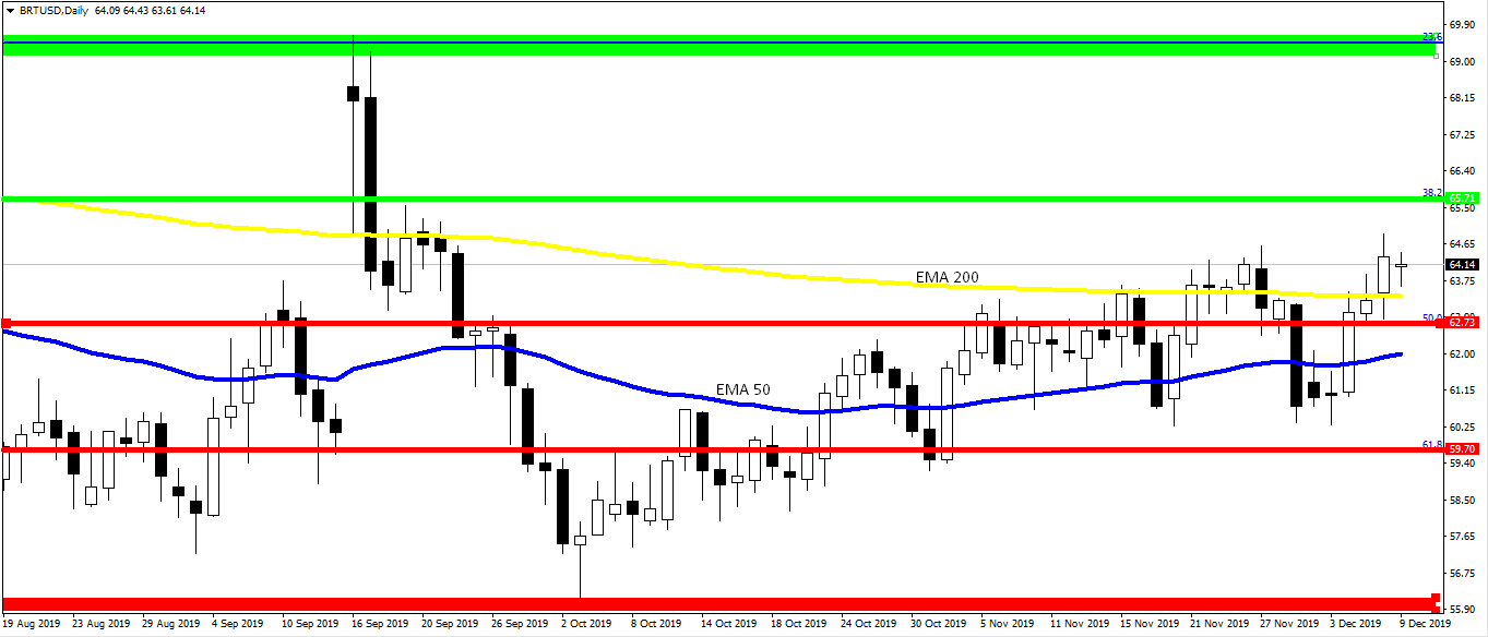 Z technicznego punktu widzenia kursowi ropy Brent udało się w piątek przebić linię 200-okresowej średniej kroczącej przebiegającą w pobliżu poziomu 63,40 dolarów . Kolejny poziom oporu jest teraz na 65,70 dolarów, gdzie przebiega 38,2% zniesienie Fibonacci fali wzrostowej trwającej od grudnia 2018 roku do kwietnia 2019 roku. Z kolei silnym poziomem wsparcia jest 62,70 dolarów, będące 50% zniesieniem Fibonacci wspomnianej wyżej fali wzrostowej.