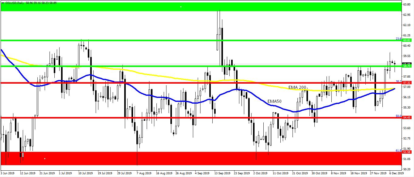 Z technicznego punktu widzenia kurs ropy WTI po udanym przebiciu kluczowego poziomu 57,30 dolarów, będącego 38,2% zniesieniem Fibonacci fali wzrostowej trwającej od grudnia 2018 roku do kwietnia 2019 roku, pokonał również w piątek poziom oporu na 58,70 dolarów. Kurs ma więc teraz otwartą drogę w stronę poziomu 60,80 dolarów gdzie przebiega 23,6% zniesienie Fibonacci wspomnianej wyżej fali. Natomiast powrót kursu do kanału trendu bocznego mógłby nastąpić w przypadku spadku poniżej poziom 57,30 dolarów, który stanowi obecnie kluczowe wsparcie dla tego kursu.