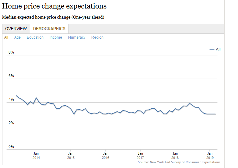 Za brak zmiany w oczekiwaniach (co jest równoznaczne z niską jak na USA dynamiką) jest odpowiedzialna grupa osób zarabiająca ponad 100 000 USD rocznie. Grupa najbogatszych osób w Stanach oczekuje, że w ciągu najbliższego roku ceny nieruchomości podrożeją o 2,47%, co jest wartością niższą od wyniku z ankiety za luty kiedy to ta sama grupa przewidywała wzrost na poziomie 3%. Czyżby grupa ta była lepiej poinformowana?