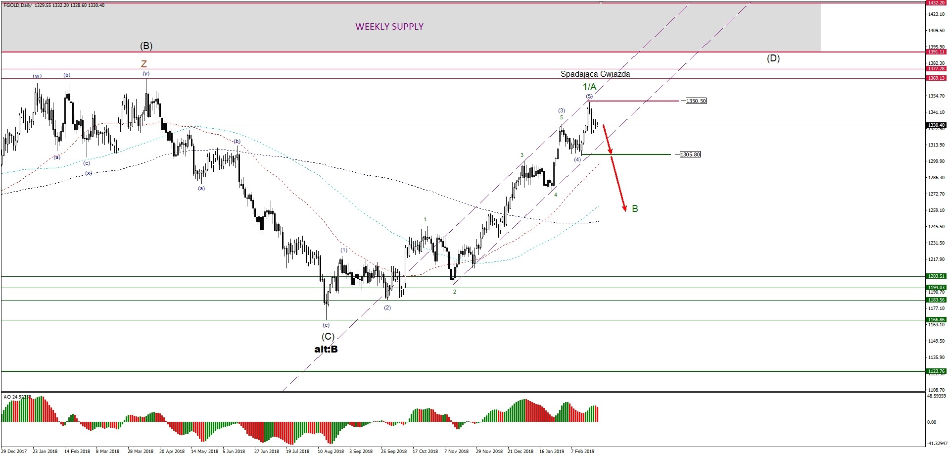 Kontynuując wczorajszą analizę Złota na interwale tygodniowym (którą możecie znaleźć tutaj), dziś przyjrzymy się bardziej szczegółowo ostatniej fali wzrostowej na interwale dziennym. Wzrosty z poziomu dołka fali (C) na $1166 mają charakter impulsywny i zostały już zakończone na poziomie $1350. Szczyt fali A kończy się ponadto formacją świecową Spadającej Gwiazdy, co dodatkowo potwierdza możliwość zakończenia impulsu wzrostowego na tym poziomie. Ponieważ sam wzrost jest pięciofalowy, więc fala (D) formacji Trójkąta z większego interwału czasowego nie może zostać zakończona, gdyż do tego potrzebna jest jeszcze fala B i fala C. Kiedy te fale zostaną zakończone, to zostanie wyrysowana formacja korekcyjna Zyg-Zaka w fali (D). Na razie cena porusza się jeszcze w kanale wzrostowym, więc aby dodatkowo potwierdzić to, że szczyt fali A jest już wykonany przez uczestników rynku, potrzebna jest silna fala spadkowa, która wyrzuci cenę dołem z kanału. Co więcej, wybicie dołem poziomu $1305 będzie następnym potwierdzeniem szczytu fali A i rynek znajdzie się w spadkowym cyklu korekcyjnym fali B. Poziomy docelowe dla fali B jeszcze nie mogą zostać wyznaczone.