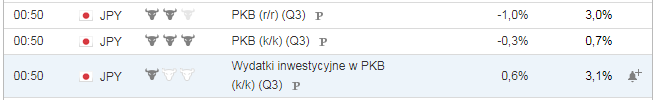 Sesja w tym dniu zapowiada się bardzo interesująco i upłynie pod znakiem publikacji wskaźników inflacji CPI oraz dynamik PKB. Zaczynamy 50 minut po północy odczytem dynamiki PKB z Japonii, gdzie analitycy po dobrym drugim kwartale (wzrost o 0,7% k/k) oczekują znaczącego spowolnienie w trzecim (spadek o -0,3% k/k). W analizie raportu warto zwrócić uwagę na dynamikę wydatków na inwestycje.
