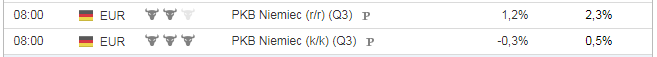 O 8:00 poznamy wskaźnik PKB z Niemiec. Podobnie jak w przypadku danych z Japonii, i tutaj oczekuje się spowolnienia w trzecim kwartale (-0,3% k/k) w stosunku do mocnego drugiego kwartału (z dynamiką 0,5% k/k). Na bazie rocznej analitycy prognozują odczyt 1,2% w trzecim kwartale w stosunku do 2,3% w drugim.