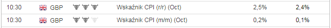 Najbardziej istotną dla rynku dolara amerykańskiego może okazać się publikacja o 14:30 wskaźnika inflacji konsumentów CPI z USA. Zgodnie z opinią analityków wskaźnik inflacji ma przyśpieszyć w październiku do 2,5% r/r i 0,3% m/m.