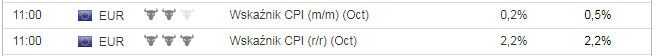 W kontekście danych makro dzień ten zapowiada się bardzo spokojnie. Z pierwszoplanowych publikacji warto odnotować jedynie dane Eurostatu na temat inflacji konsumentów ze Strefy Euro – publikacja o 11:00. Analitycy oczekują, iż inflacja w październiku wyniesie 2,2% r/r i 0,2% m/m.