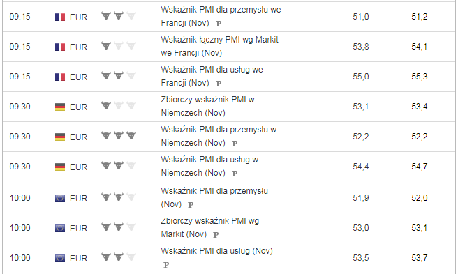 Dzień rozpoczynamy wstępnym odczytami indeksów PMI w sektorze usług i przemysłu za listopad dla szeregu krajów europejskich i Strefy Euro. Warto wziąć pod uwagę, iż na tych danych cieniem może położyć się niepewność związana z negocjacjami umowy separacyjnej na linii Wielka Brytania – Unia.