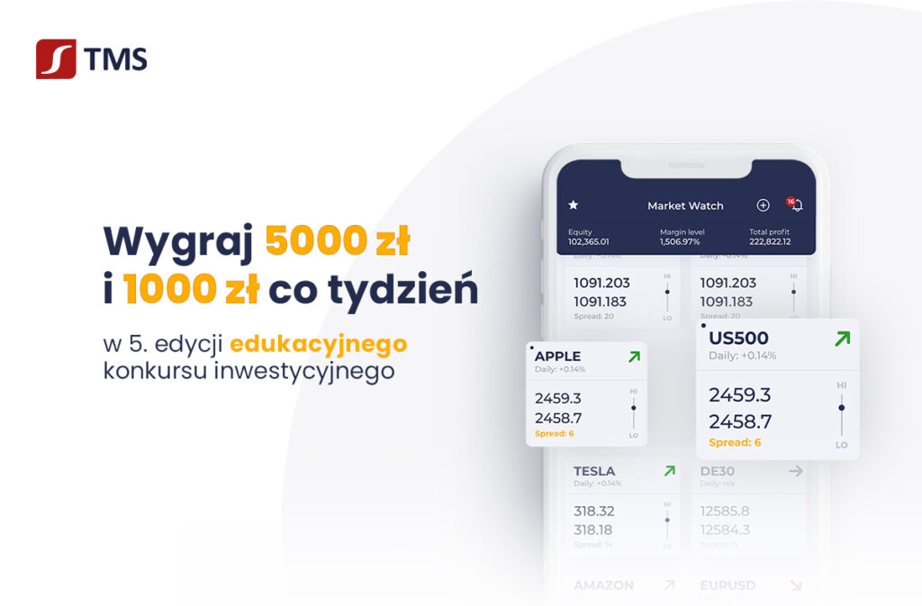 9 marca rusza 5. edycja bezpłatnego konkursu inwestycyjnego w aplikacji mobilnej TMS Brokers. Konkurs jest świętem TMS, gdyż pokazuje, że ta akcja edukacyjna cieszy się niezwykłym zainteresowaniem osób, które chcą poznać bliżej świat inwestycji. Konkurs polega na tym, że uczestnicy inwestują otrzymane wirtualne 10 000 EUR i grają o realne nagrody, wykręcając jak najwyższe stopy zwrotu. Pula nagród wynosi aż 14 500 złotych.