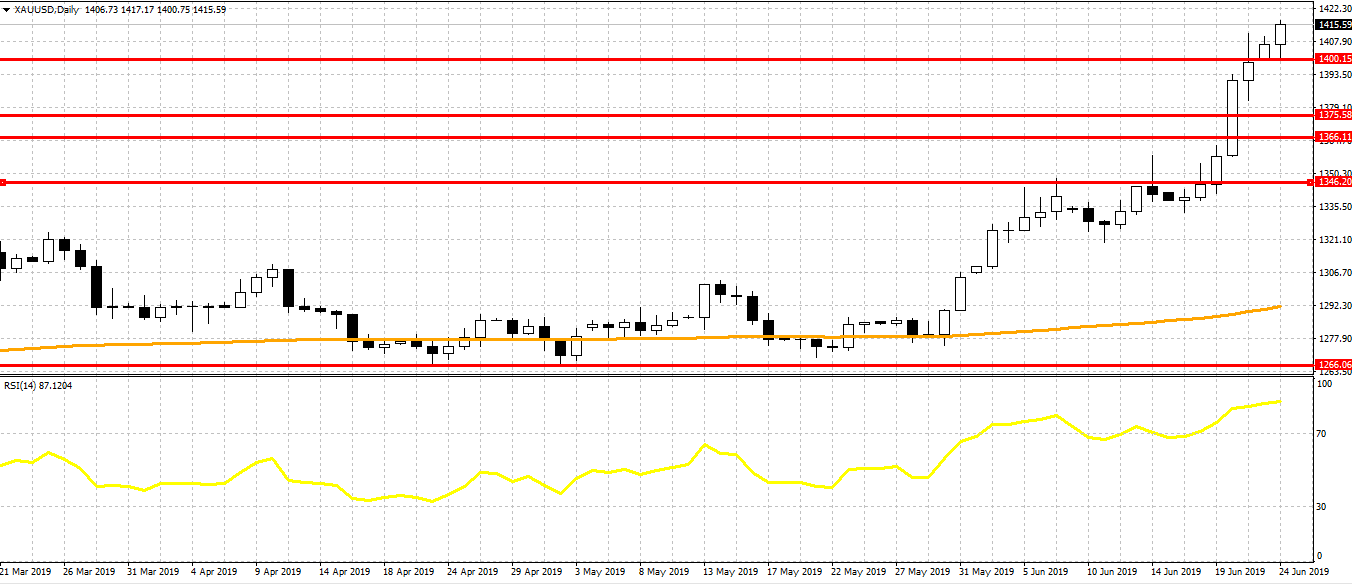 W piątek Donald Trump zapowiedział , że jest gotowy przeprowadzić naloty na irańskie cele w odwecie za ruch Iranu, który zestrzelił amerykańskiego drona. Na szczęście ponoć w ostatniej chwili te loty odwołał, ale według doniesień mediów Amerykanie przeprowadzili cyberataki na irańskie systemy kontroli wyrzutni rakietowych. Obecną wycenę złota wspiera też niepewność dotycząca wyników zaplanowanego na 28 i 29 czerwca szczytu przywódców państw G20, na którym powinno dojść do spotkania Donalda Trumpa z chińskim prezydentem XI Jinpingiem, w patowej sprawie toczącej się między oboma krajami wojny handlowej.
